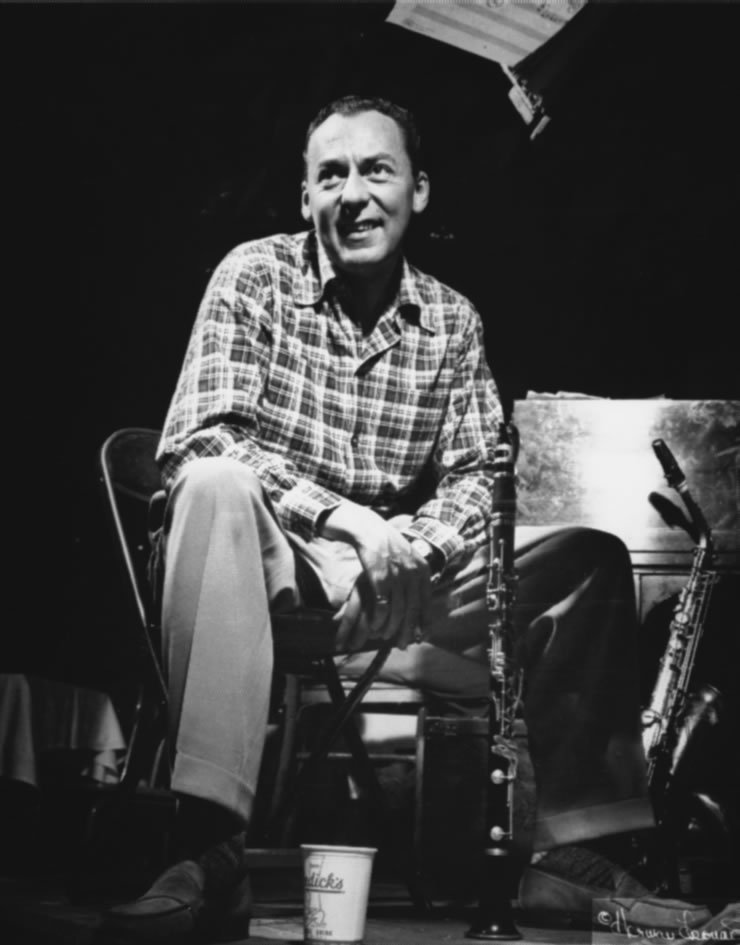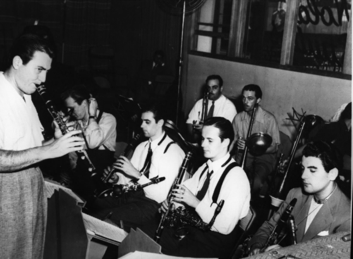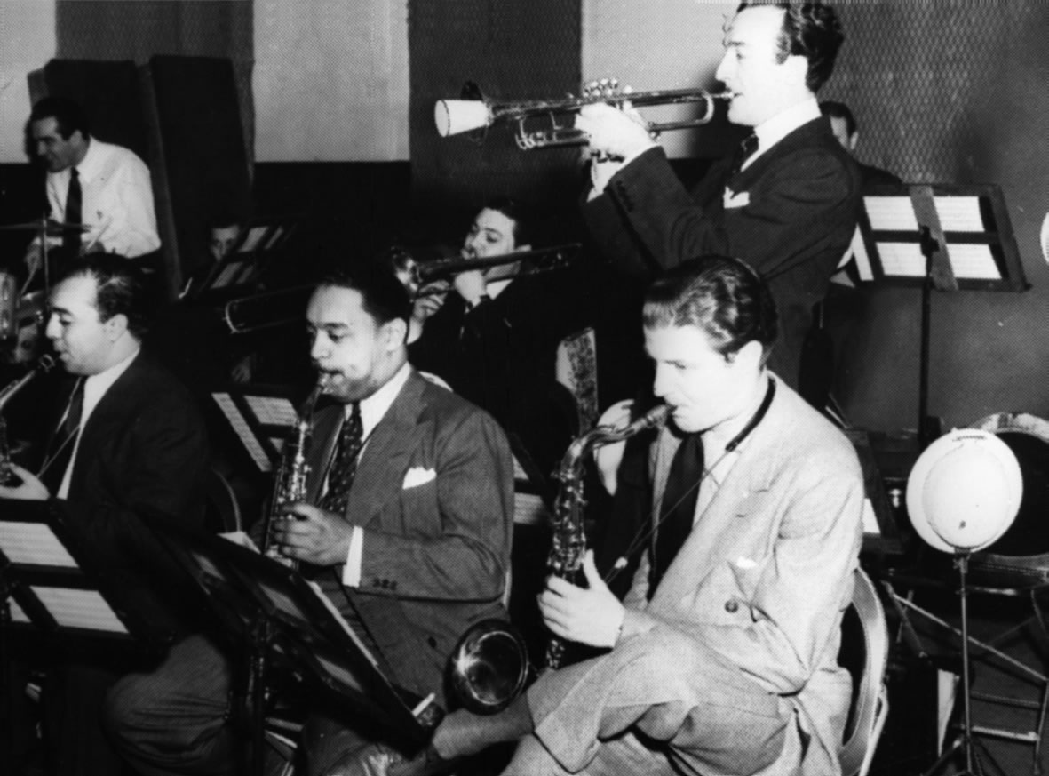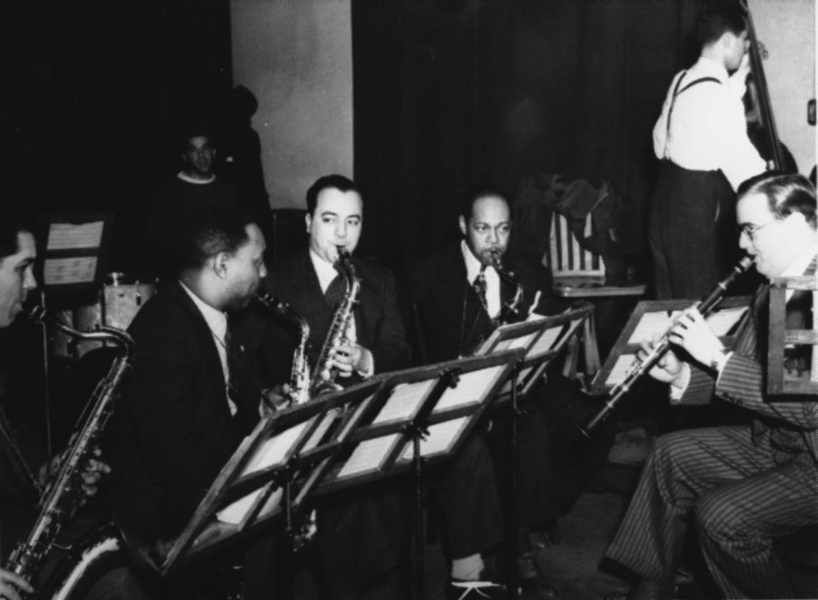 Metronome All Stars with Benny Goodman (r), Coleman Hawkins (3d from l) and Buddy Rich (dr), 1940